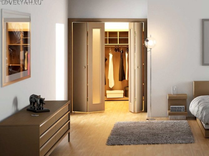 Ce produit est une excellente alternative à la conception de la balançoire. Il a des rabats qui glissent le long des guides métalliques. La porte pliante pliante a une taille compacte. En raison de cette caractéristique, il est utilisé dans l'agencement de petites pièces (dressings, couloirs étroits, salle de bain et cuisine).