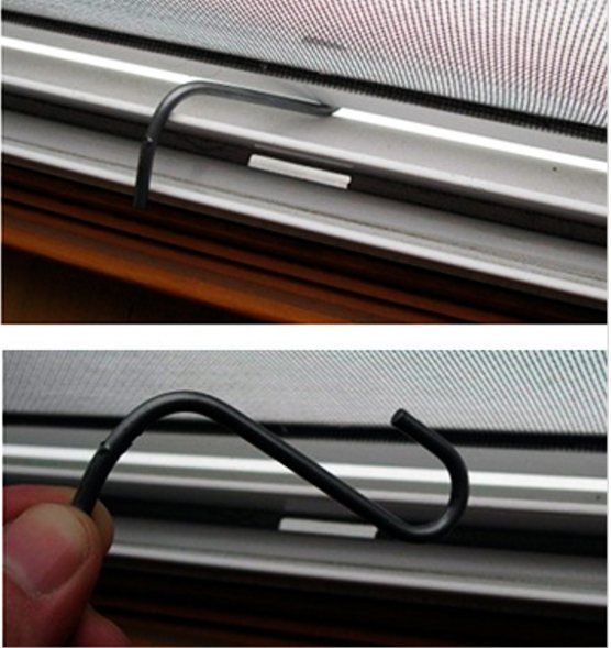 Aussi étrange que cette idée puisse paraître, elle est durable et pour longtemps. Les crochets à vêtements en fer sont un excellent remplacement pour attacher les moustiquaires. C'est assez facile de les faire. Il est nécessaire de visiter la quincaillerie la plus proche et d'acheter de petites patères. Après cela, à l'aide d'un tournevis, vous devez connecter les nouvelles attaches au site "d'accident" des attaches précédentes. Eh bien, c'est tout, maintenant les attaches ne se cassent plus, car casser le fer est un travail assez laborieux.
