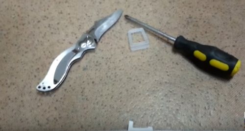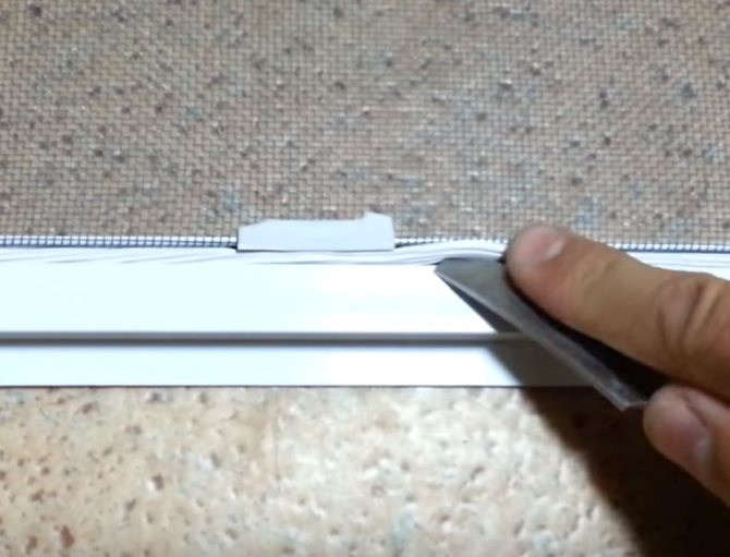 - À l'aide d'un tournevis ou d'un couteau, vous devez retirer le sceau exactement aux endroits où se trouvaient les poignées cassées et retirer le plastique restant. Ne retirez pas tout le joint en caoutchouc du treillis - sans outils spéciaux, il sera très difficile de le mettre en place.