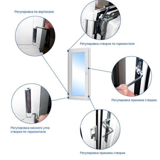 Un ajustement vertical ou horizontal aidera à éliminer l'inclinaison de la fenêtre en PVC. Les vis sont conçues pour ramener le mécanisme dans un seul plan, qui sont faciles à trouver de l'intérieur du profilé. Il est nécessaire d'accéder aux vis latérales et inférieures cachées sur les charnières sous les capuchons spéciaux.