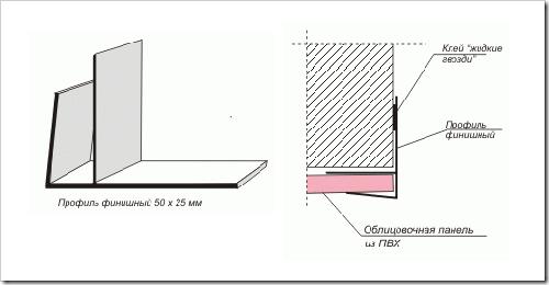 Installation d'un profil en forme de F. Ce profil est soigneusement coupé avec un couteau tranchant et inséré dans les panneaux en plastique installés. Dans les endroits où le platband jouxte les vis autotaraudeuses, effectuez des coupes.