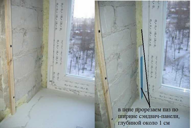 Lors de l'installation de pentes latérales, n'oubliez pas de faire mousser le bas et le haut de la pente. Si vous ne mousse pas dans ces endroits, alors après l'achèvement de tous les travaux, ces endroits "marcheront" - il n'y a pas de mousse là-bas.