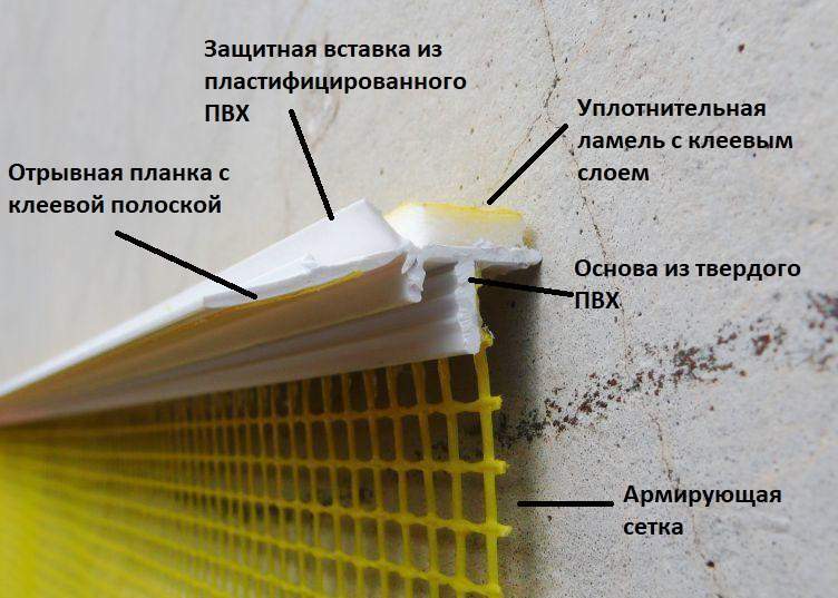 À l'aide d'un tel profil de départ, des pentes standard sont installées à partir de plastique ou de plaques de plâtre d'une épaisseur de 10 mm. Sa section transversale se compose de trois étagères: une large et deux étroites.