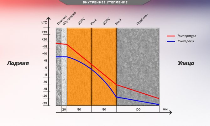 Sur la figure 1, la zone avec la température du « point de rosée » est marquée en bleu. C'est une zone à risque. S'il y a un accès d'air chaud et humide de l'appartement, la condensation commencera à tomber.Pour éliminer complètement ce phénomène désagréable, dès le premier ordre, nous isolons toujours la paroi intérieure à égalité avec les autres. La figure 2 montre à quoi cela ressemble approximativement.