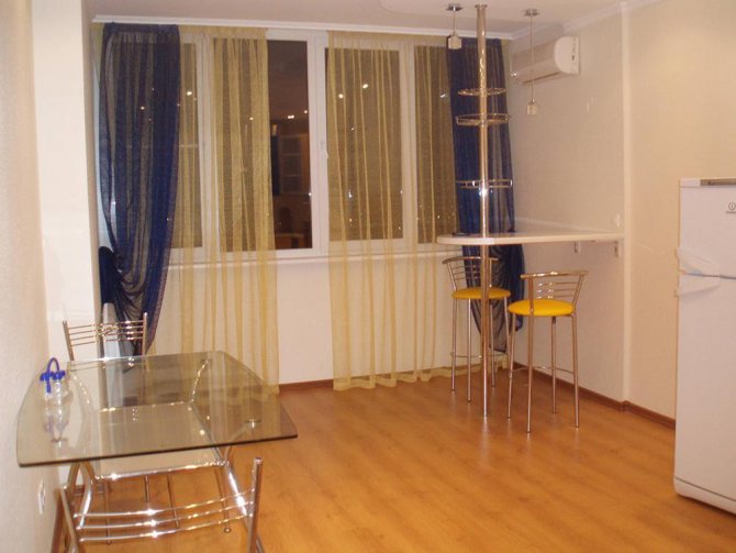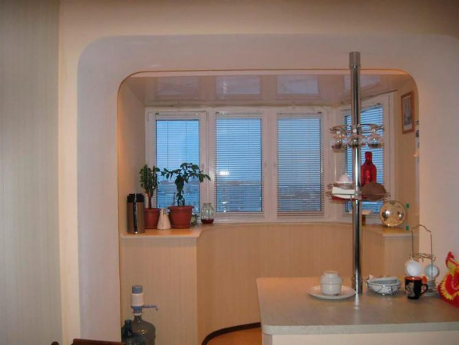 C'est l'option la plus simple et la plus économique, qui ne nécessite pas l'approbation des autorités supérieures. Son essence réside dans le fait que le bloc de balcon avec une porte et une fenêtre est démonté et qu'un rebord de contre-fenêtre de bar est installé à la place vacante. Il remplit la fonction de zonage de l'espace, sert de table à manger à part entière. Ceci est particulièrement important dans les petits espaces, où chaque centimètre joue un rôle. Dans de tels cas, un zonage compétent est simplement nécessaire. L'accès des deux côtés permet de loger 4 à 5 personnes en même temps derrière le bar. De plus, un tel intérieur n'a pas l'air débordé.