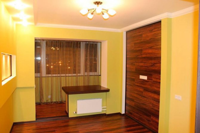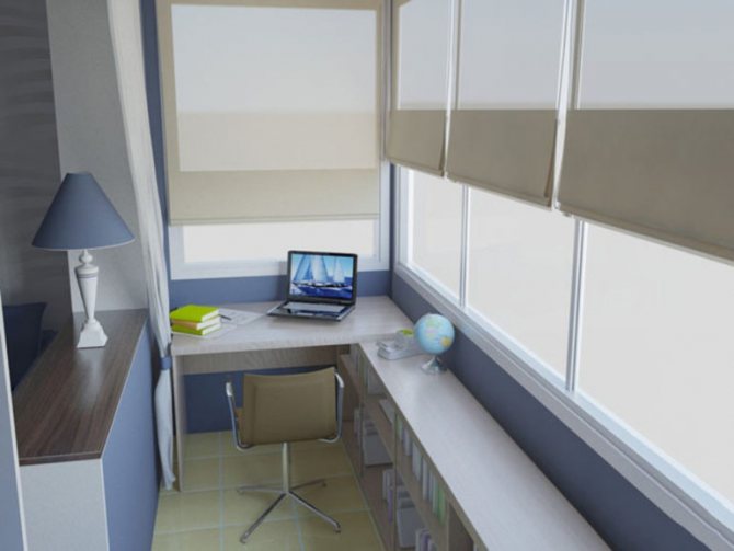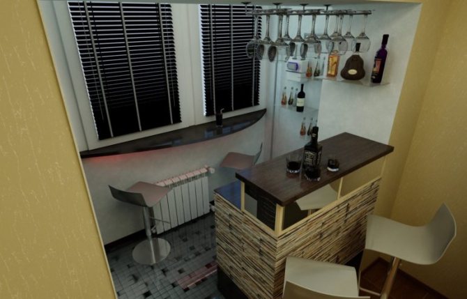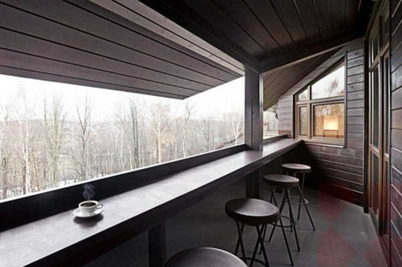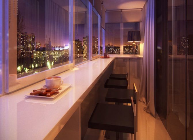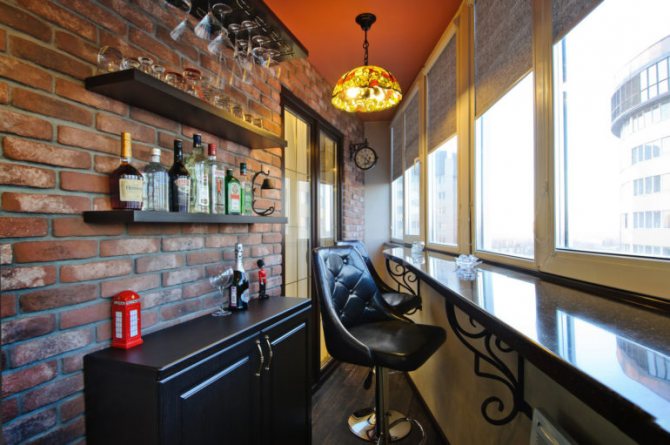 Cette option peut être mise en œuvre sans démanteler aucune structure. Tout ce qui est nécessaire pour cela, c'est de l'espace libre et un balcon vitré. Le comptoir du bar sur la loggia est situé le long du mur près de la fenêtre du balcon en ligne droite. Si la longueur le permet, vous pouvez effectuer des virages dans les coins aux extrémités. La largeur du comptoir ne doit pas dépasser 1/3 de la largeur du balcon, sinon l'espace sera très étroit.
