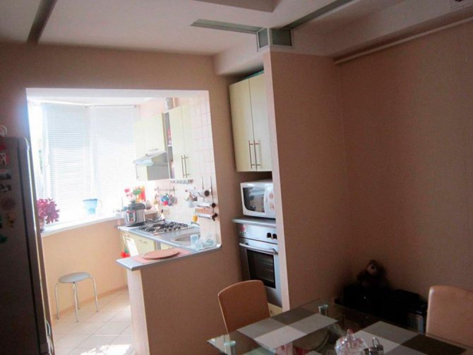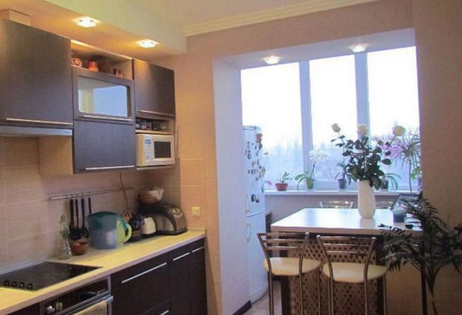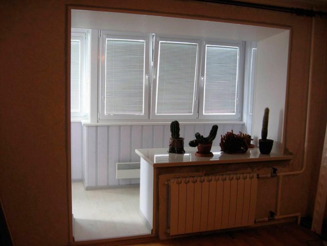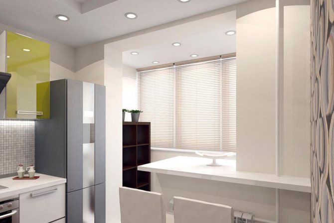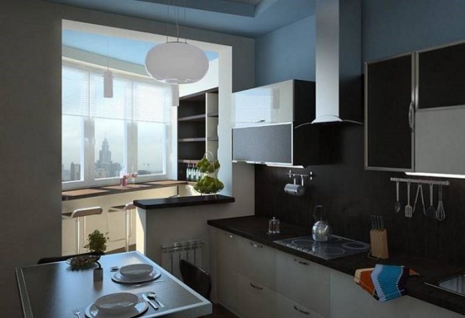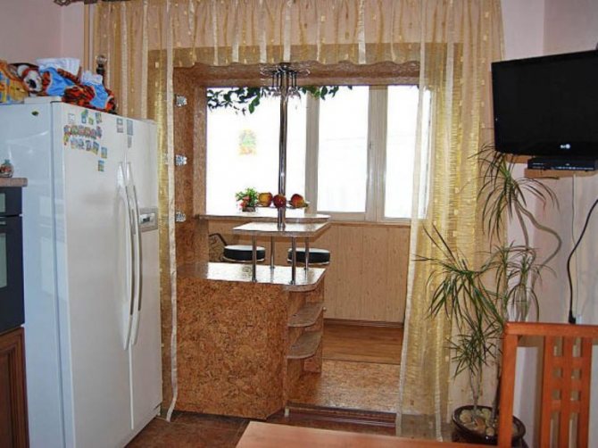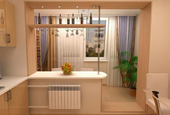 Cette version du comptoir de bar suppose la démolition complète de la structure du mur et du balcon. Un comptoir de bar est en cours d'installation dans la cuisine à la place de l'ancien appui de fenêtre.Un tel réaménagement nécessite l'obtention d'une autorisation pour les travaux de construction dans les agences gouvernementales, car il s'agit de déplacer le radiateur sur le balcon. Un démontage non autorisé menace d'une forte amende et d'un ordre de remettre l'intérieur à son état d'origine, vous ne devez donc pas négliger les règles. Pour les petits appartements, ces réparations sont la seule option possible pour améliorer les conditions de vie.