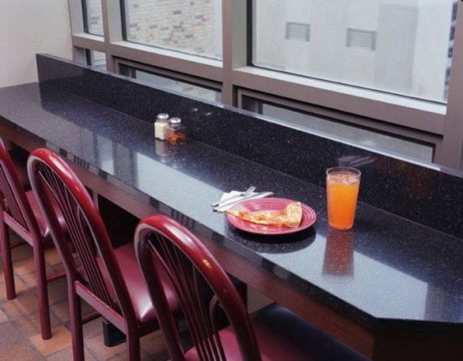 Une cuisine avec un bar près de la fenêtre est le rêve de toute hôtesse, cependant, le choix des matériaux ici doit être abordé avec une attention particulière et responsable. Le fait est qu'une charge spéciale tombe sur le comptoir: s'il est situé au soleil, il est constamment exposé aux rayons ultraviolets. Si la structure est située à proximité d'un radiateur, elle doit être résistante aux températures élevées. S'il y a un mauvais chauffage sur le balcon, il doit être résistant à l'humidité. Étant donné que le bar est souvent utilisé comme table à manger ou comme lieu de collation, les taches grasses et sales ne peuvent être évitées. Par conséquent, le matériau de surface du comptoir de barres doit être solide, durable, résistant aux dommages mécaniques et aux effets de la température.