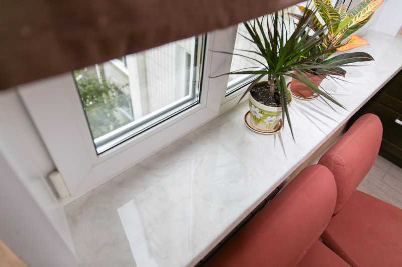 Les dalles pour appuis de fenêtre à base minérale (copeaux de pierre) liés avec des résines polymères sont moins chères que leurs homologues naturels en pierre solide. L'option n'est pas moins impressionnante : riche, intéressante à regarder. Le matériau n'est pas inférieur en caractéristiques positives aux dalles monobloc naturelles.