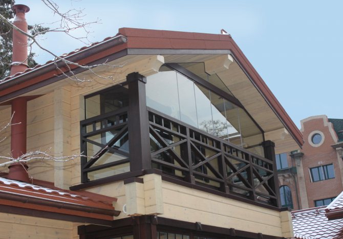 Le vitrage d'un balcon dans une maison en rondins est magnifique, remplissant une fonction décorative et pratique, par exemple, un jardin d'hiver. Ils peuvent être construits en façade ou en toiture, dans l'approfondissement de la façade, ou, au contraire, faire saillie au-delà de son territoire. Pour installer le toit, un système de chevrons suspendus est utilisé, assemblé à partir d'une barre en bois. La base est étanche et isolée.