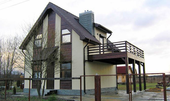 Habituellement, le balcon est situé dans la partie centrale de la maison et a un toit commun avec lui. Cette option d'emplacement est la mieux adaptée pour les bâtiments de faible hauteur. Cet agencement permet d'équiper au mieux la zone de loisirs, à l'abri des intempéries et des rayons de soleil torrides. Un espace suffisant vous permet d'installer ici des meubles pliants ou en plastique: tables, chaises.