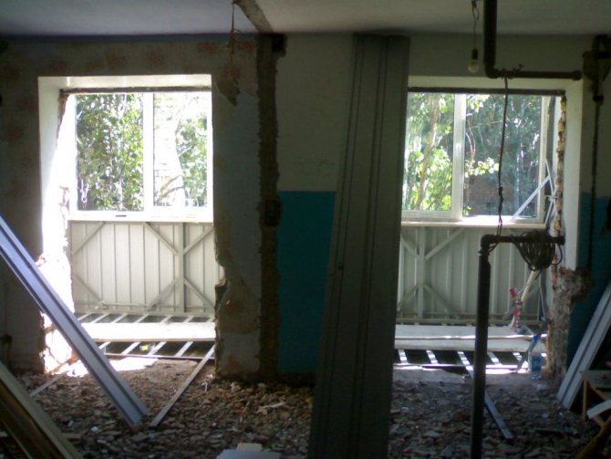 L'ancien bloc de fenêtre et le rebord de la fenêtre sont démontés et une ouverture de la largeur correspondante est faite dans le mur - pour la future porte.