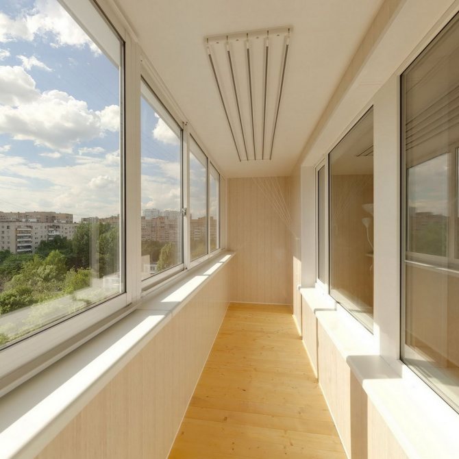 Cette option vous permet de créer un balcon de presque toutes les tailles de vos propres mains: vous pouvez le sortir sur une assez grande largeur et l'étirer sur tout l'appartement sans affecter les voisins. Le résultat est une terrasse vitrée unique.