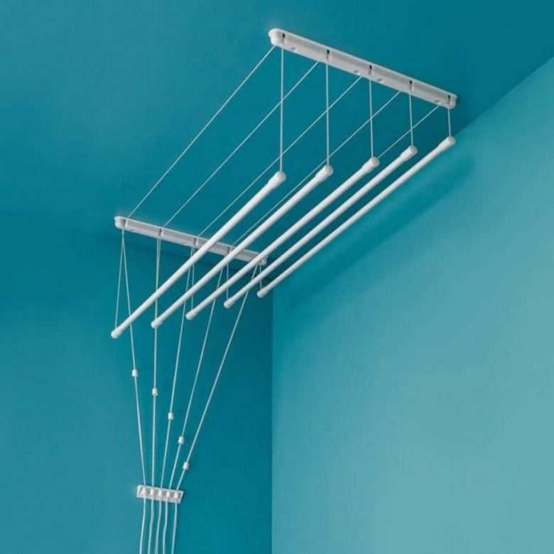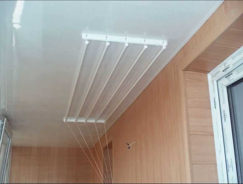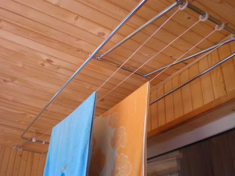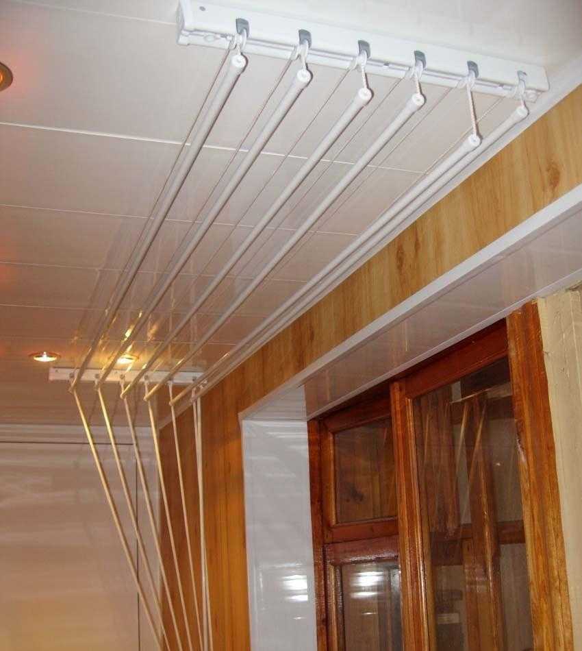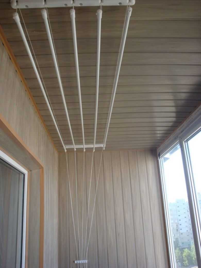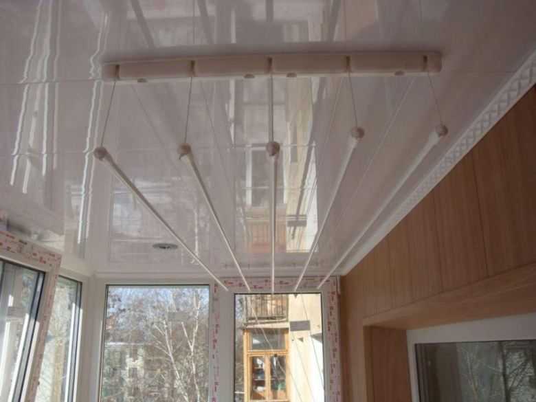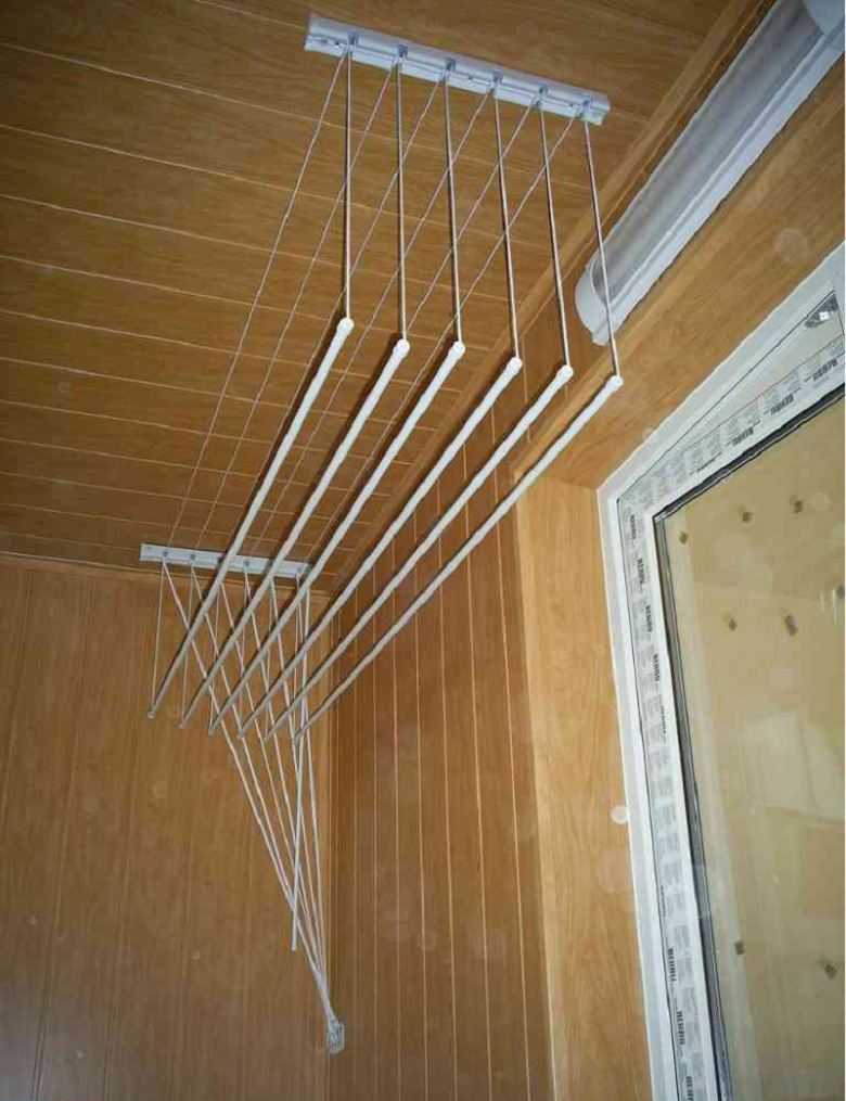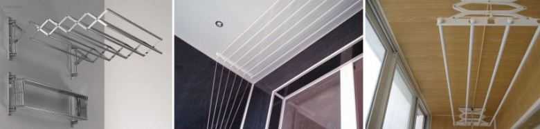 Les sèche-linge montés au plafond d'un balcon ou d'une loggia sont l'un des modèles les plus populaires. Ce sont deux lattes avec des barres transversales ou des cordes attachées, sur lesquelles le linge est suspendu.