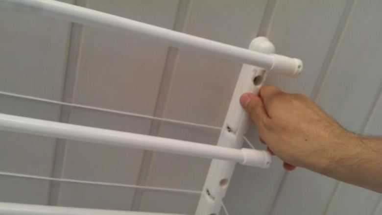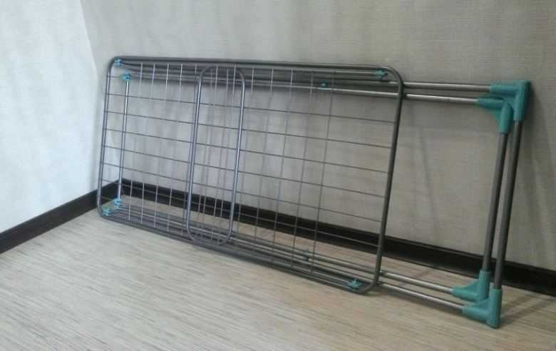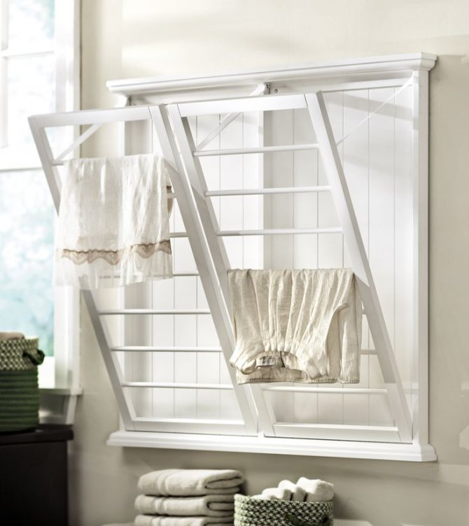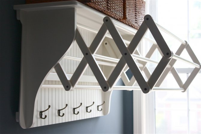 La deuxième option est plus facile à installer, moins chère, mais moins pratique. Toutes les planches sont à la même hauteur. Cela rend difficile le séchage du linge près du mur ou dans les rangées du milieu. Le deuxième point: une sécheuse chargée de linge humide n'est pas si facile à soulever.