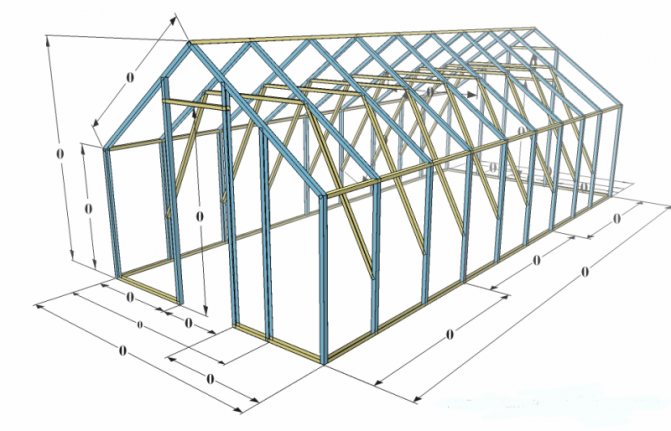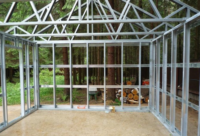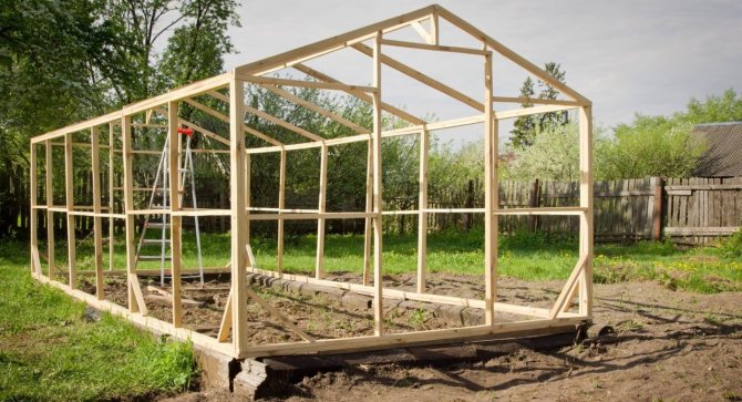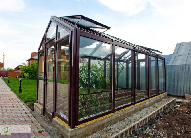 La serre peut être sans cadre si vous utilisez des fenêtres à double vitrage à une chambre. Ils sont légers et peuvent supporter une petite charge. Pour une structure de capital, un cadre en bois est fourni, sinon les extrémités des fenêtres à double vitrage finiront par se disperser.