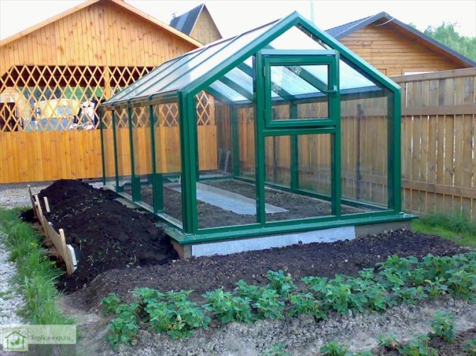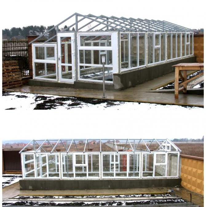 La construction d'une serre en plastique pèse beaucoup de sorte qu'avec le temps les fenêtres à double vitrage ne se déforment pas, elle est installée sur les fondations. Cela aide aussi à garder plus de chaleur. Des artisans expérimentés affirment que 10 % des pertes de chaleur peuvent être économisées.