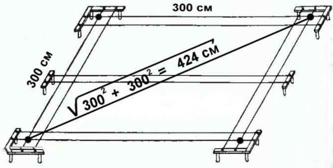 Après avoir préparé le site, vous devez marquer la future structure. Ceci est fait pour que la crête de la serre soit située du nord au sud. Ensuite, il y aura toujours un éclairage uniforme à l'intérieur de la structure. Pour ces travaux, des piquets, des cordes et un ruban à mesurer sont utilisés. Toutes les dimensions sont soigneusement vérifiées par rapport au plan.