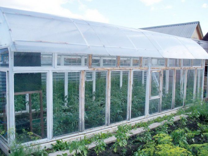 La version des fenêtres et des portes en plastique, où la plupart des murs sont recouverts de plastique, convient à la culture mixte. Certaines cultures sont plantées sur le lit du jardin du côté où les fenêtres partent du sol. Et le reste des plantes est placé sur les étagères.