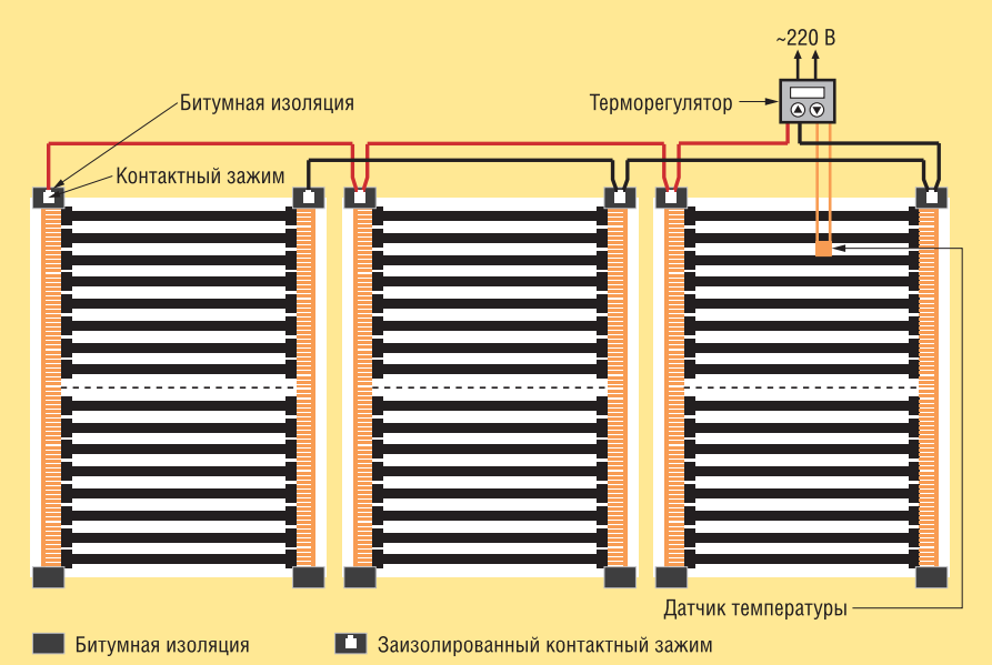 La structure se compose d'un film à base de polymère, qui est divisé en carrés avec des plaques scellées. Un grand nombre de plaques sont installées en surface, qui sont connectées au réseau et chauffées à l'électricité.