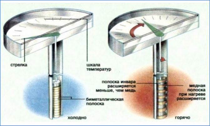 C'est une autre option simple et bon marché, mais pas aussi précise. Cela ressemble à une montre. Il fonctionne grâce au fonctionnement d'une spirale spéciale, qui est assemblée à partir de deux bandes. Chaque bande est en métal et deux métaux différents forment un ressort bimétallique. La précision des lectures d'un tel modèle est faible.