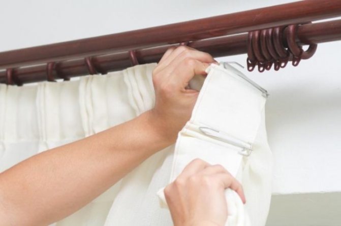 Pour accrocher des rideaux, vous devez vous tenir debout et les accrocher à chaque crochet ou anneau (si montage standard).