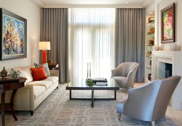 Si vous ne voulez pas suspendre de lourds rideaux, choisissez un design multicouche. Tulle léger et deux ou trois ensembles de rideaux plus épais. Ils constituent des ensembles de transmittance lumineuse différente, ajustant l'éclairage en fonction de la météo.