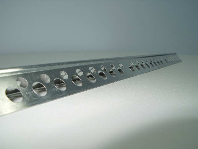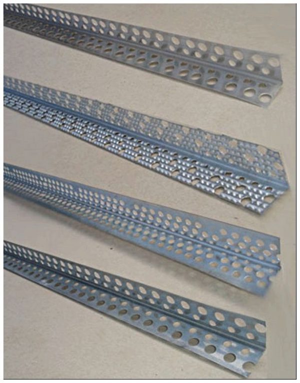 Très souvent, des superpositions de rigidité accrue sont nécessaires aux coins intérieurs et extérieurs. À cette fin, des profilés en aluminium sont utilisés, qui sont un long coin étroit, de 2,5 à 3 mètres, avec une largeur d'étagère de 2,5 centimètres. Il existe deux types de ce profil: décoratif et perforé, le premier a une surface lisse des étagères, le second - perforation sur toute la longueur. En règle générale, des trous d'un diamètre de 2,5 millimètres sont percés en damier, ils sont nécessaires pour fixer fermement le coin dans une couche de mastic ou de plâtre lors de la formation des coins des murs.