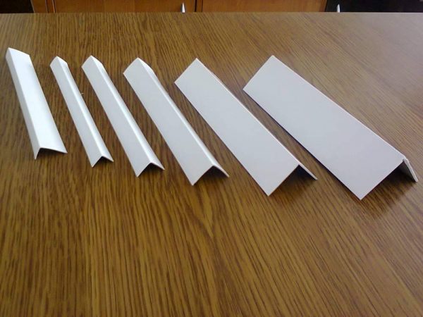 Les étagères profilées ont différentes tailles, l'angle entre elles est généralement de 90 degrés. Quant aux dimensions, avec une longueur de 2 mètres, la largeur des étagères est de 10 × 10, 15 × 15, 20 × 20, 25 × 25, 30 × 30, ainsi que 35 × 35 et 40 × 40 millimètres. Des coins moins courants avec des étagères asymétriques, comme, par exemple, 25 × 10. Il n'est pas déplacé de rappeler le profil pour la finition des ouvertures cintrées. C'est un coin flexible avec une seule norme de largeur d'étagères, convergeant à un angle de 90 degrés, dont la longueur peut être de 2,5 à 3 mètres.