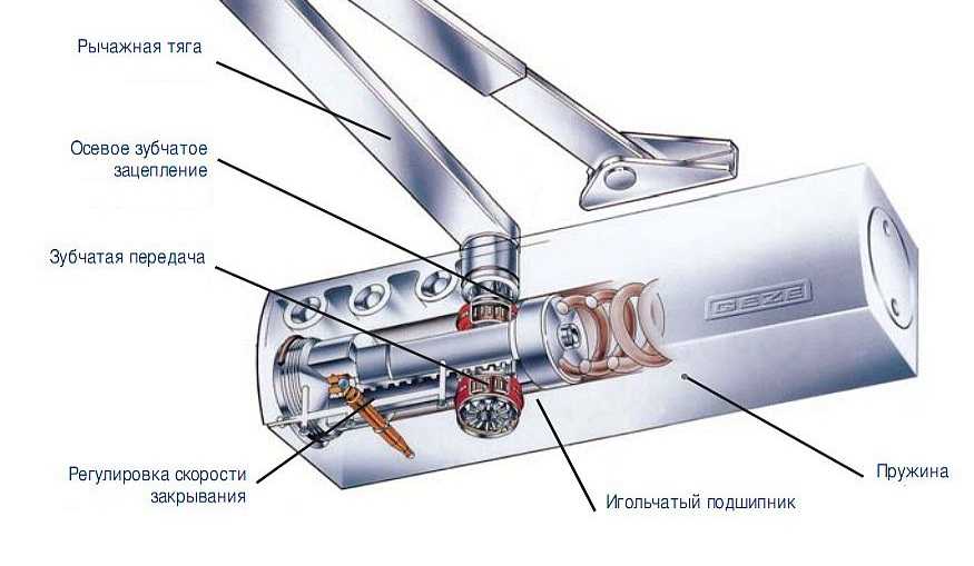 Le dispositif de ferme-porte est simple. Il ne possède pas un grand nombre de mécanismes complexes, et son action est basée sur l'accumulation d'énergie lors de l'ouverture de la porte et sa consommation pour presser le vantail contre le caisson. Ceci est le plus souvent réalisé avec un ressort, moins souvent un circuit hydraulique est utilisé. Dans ce cas, le mécanisme a une conception à crémaillère et pignon, une plus grande force d'appui et est plus cher. Le principe de fonctionnement d'un ferme-porte avec circuit hydraulique est le suivant: