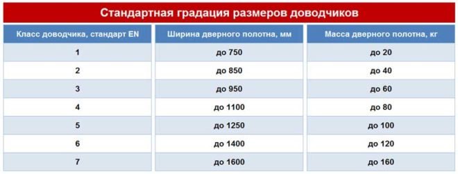 Cette caractéristique est appelée différemment - force de fermeture, taille du ferme-porte, classe selon EN. Lors du choix d'un mécanisme, les paramètres du vantail de porte sont décisifs: son poids (kg) et sa largeur (mm). Ceci est pris en compte lors de la détermination de l'option d'installation de l'appareil.