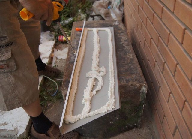 Tout d'abord, les éléments latéraux sont installés en respectant la pente requise de l'intérieur vers l'extérieur. Les parties supérieure et inférieure sont ajustées avec un couteau en fonction du niveau d'inclinaison.