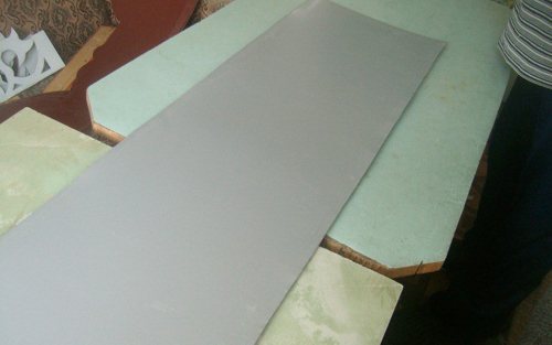 Il est plus pratique de fabriquer des plateaux sculptés pour les fenêtres métalliques sur un lieu de travail pré-préparé. Cela nécessite deux tables de même taille et hauteur. Vous devez laisser une distance de 8 cm entre eux pour que la scie sauteuse puisse manœuvrer. Le plus souvent, un métal de deux couleurs est utilisé pour la fabrication de plateaux: la feuille supérieure peut être choisie blanche et la feuille inférieure, qui servira de doublure de fond, peut être quelconque.