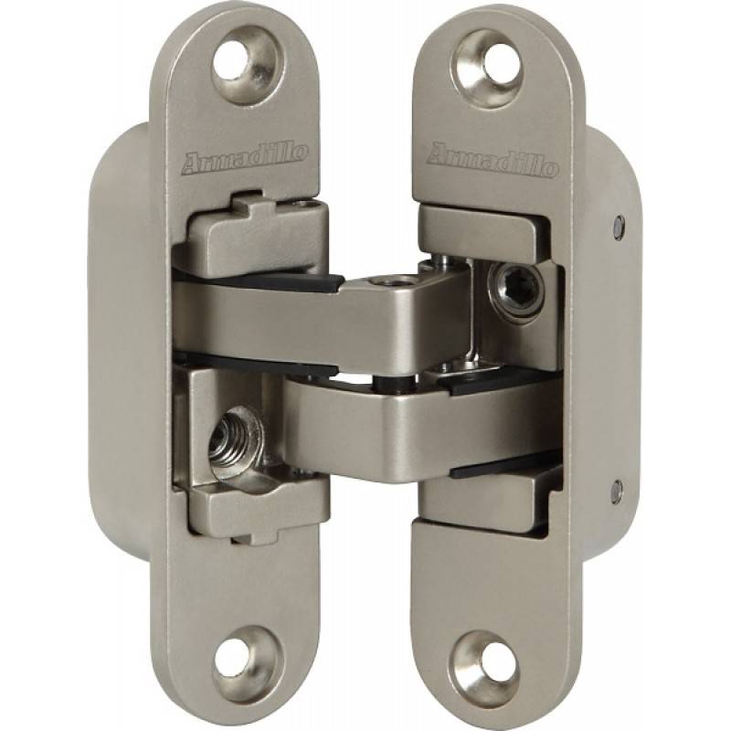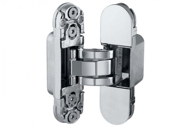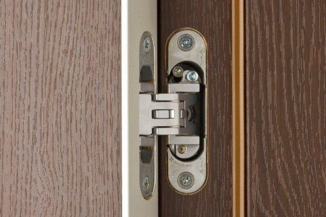 - Caché. Les ferrures sont installées sur des portes d'entrée coûteuses. La conception de la charnière dissimulée est une charnière encastrée lorsqu'elle est installée dans le corps du bloc de porte.