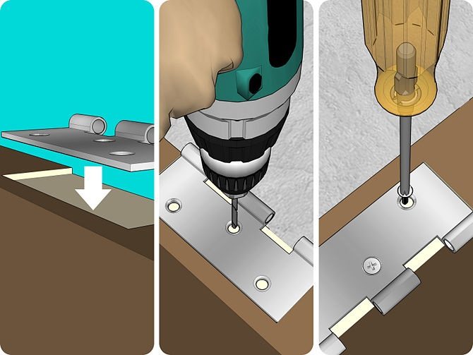 Pour installer des charnières à vis, il suffit d'avoir une perceuse électrique. Les raccords sont généralement vendus avec un gabarit de montage.