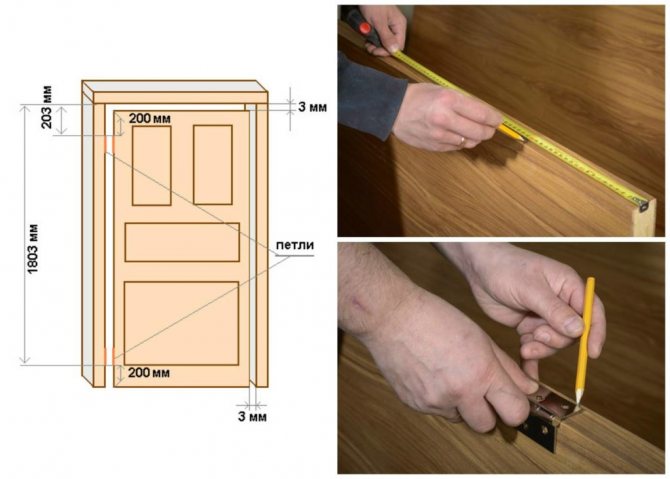 Après marquage, la porte est placée dans une boîte en la calant avec des cales de manière à obtenir le même écart d'environ 3 mm autour du périmètre. Les prochaines étapes consistent à déterminer le lieu de fixation de la contrepartie de la charnière sur le cadre. La position du vantail est vérifiée avec un niveau pour éviter les déformations. Lorsque la toile est uniformément exposée, le lieu de fixation de la deuxième partie de la boucle est marqué sur la boîte.