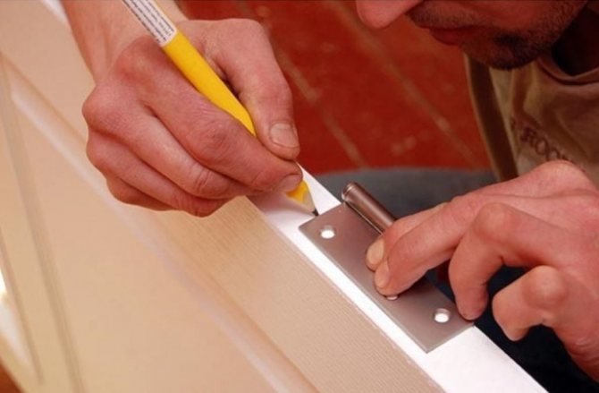 Le processus de marquage lors de l'installation de charnières sur une porte consiste à délimiter le contour des plaques de montage ou des broches. Les étapes suivantes dépendent du type de raccords. Les modèles suspendus sont simplement fixés avec des vis autotaraudeuses. Pour les fixations à mortaise, choisissez un évidement avec un ciseau ou une fraise. Pour les modèles à visser, des trous sont percés.