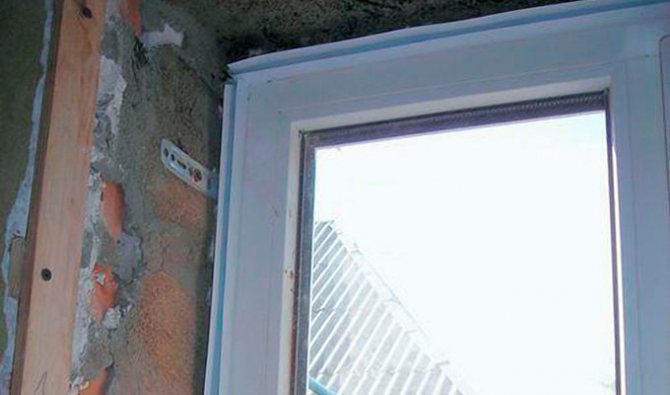 Et maintenant, nous mettons un profil de plâtre le long du périmètre de la pente, en utilisant activement le niveau pour vérifier l'horizontalité et la verticalité - c'est votre "balise" externe. Mais sur le cadre, vous pouvez attacher une bande de plâtre, qui a deux "étagères". Le premier se cachera sous une couche de plâtre, et le second sera un autre phare pour l'exposition de la règle.