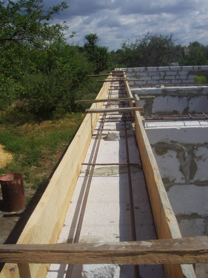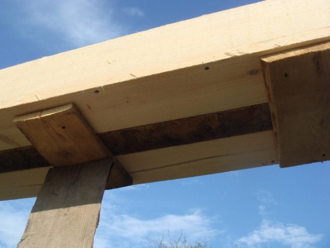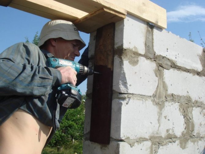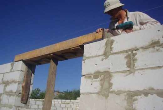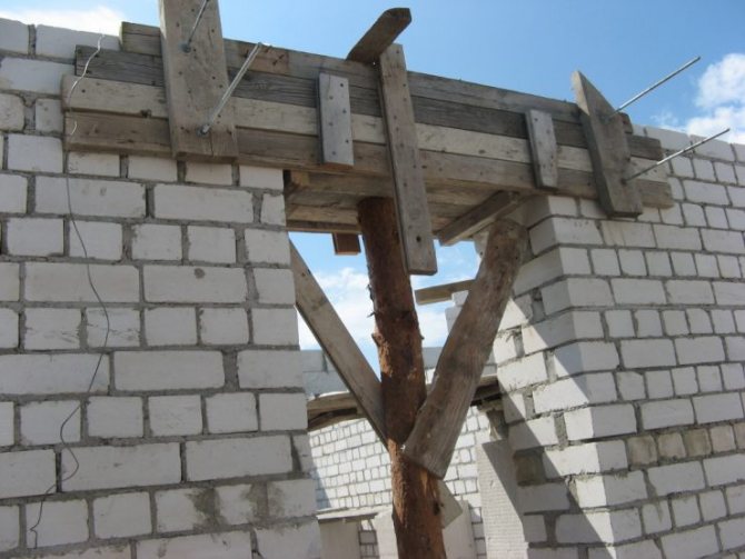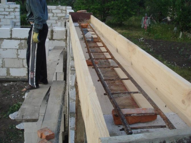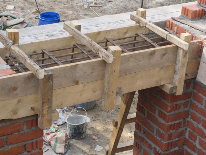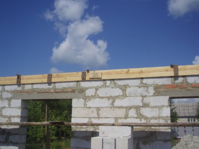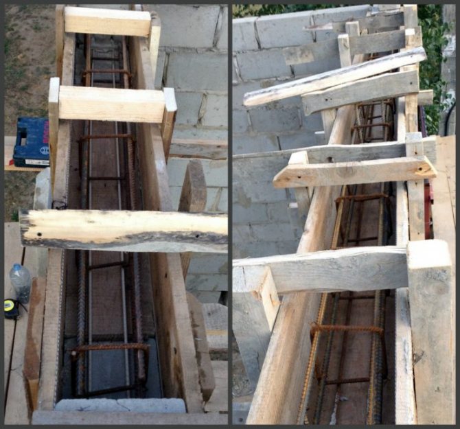 - Des supports sont faits pour le linteau afin qu'il ne se plie pas sous le poids du béton. Pour cela, une planche est installée sur la longueur de la maçonnerie supérieure, qui est soutenue par des blocs de bois, des briques ou des tuyaux métalliques.