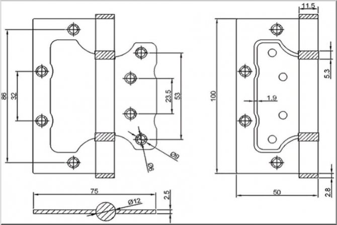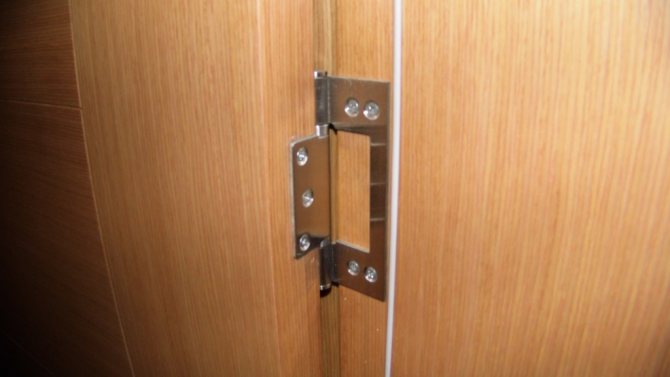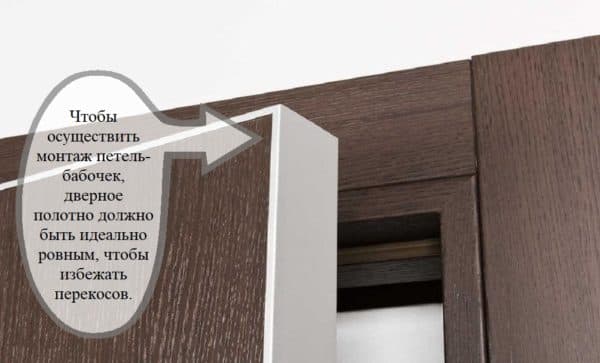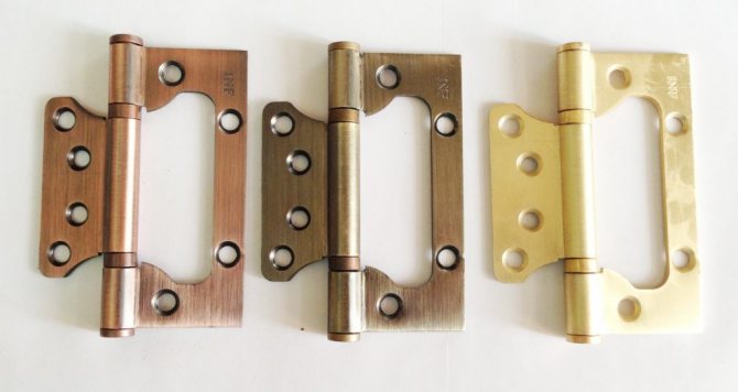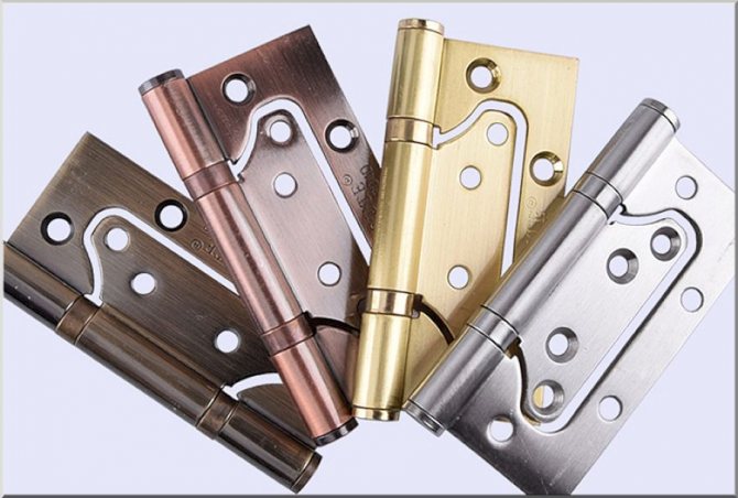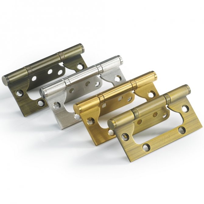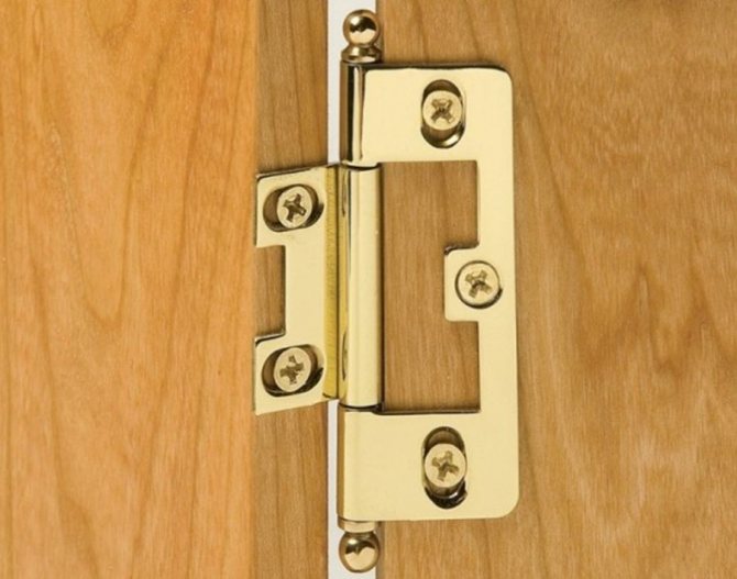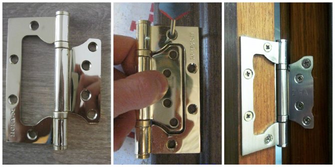Les boucles papillon sont en deux parties. Lors de leur pliage, la plus petite partie est investie dans la plus grande. Par conséquent, l'installation de charnières papillon sur les portes intérieures ne nécessite pas la pose d'une rainure. Les auvents sont fixés avec du matériel et cela ne nécessite l'utilisation d'aucun outil professionnel.