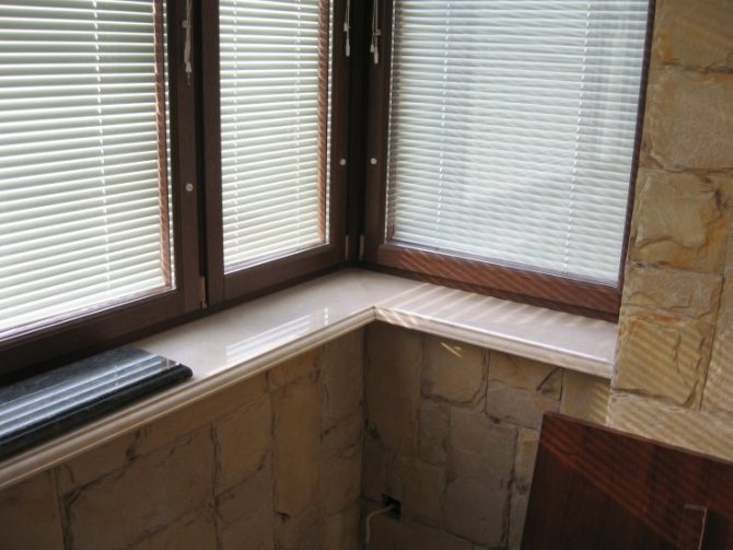 Habituellement, il n'y a pas de chauffage sur le balcon, les baisses de température sont donc inévitables en hiver. Cela signifie que le matériau doit être sélectionné en tenant compte de ces sauts. Le plus souvent, pour la fabrication d'un rebord de fenêtre, ils préfèrent utiliser le même matériau que celui utilisé dans le processus de vitrage, bien que cela ne soit pas du tout nécessaire. Lors du choix, nous examinons les performances, le coût et le poids, car la structure du balcon est légère et ne devrait pas être beaucoup plus lourde.