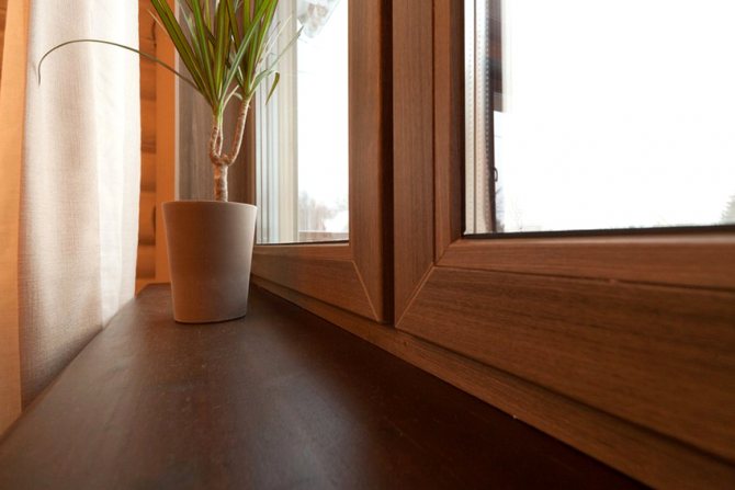 Le rebord de fenêtre en plastique peut être réalisé en blanc, couleur et imitation bois. Cette dernière option trouve son application dans les maisons en bois. Il peut également être utilisé en tandem avec des fenêtres en bois. Cependant, une telle structure, contrairement à un rebord de fenêtre en bois, se caractérise par une résistance à l'humidité, un manque de traitement pour une opération ultérieure et une longue durée de vie. L'effet imitation bois est obtenu en utilisant un film stratifié adapté.