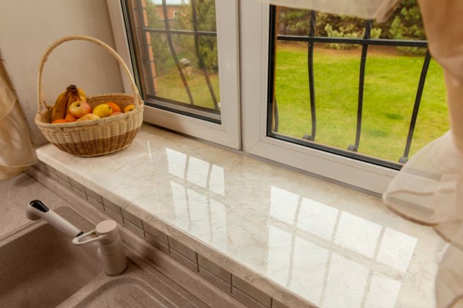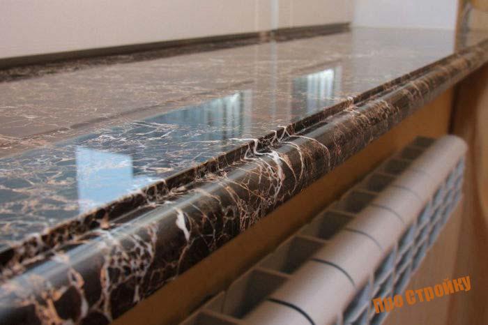 Important! L'utilisation d'un tel revêtement dans la technologie de fabrication d'un appui de fenêtre permet d'obtenir un produit imitant une pierre naturelle sous forme de marbre ou de granit.