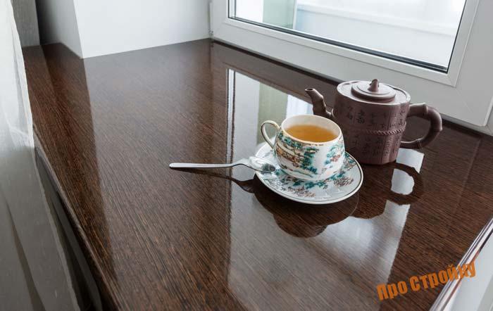 Il existe un autre type de produit sous la forme d'un appui de fenêtre en wengé, fabriqué à partir d'un mélange de PVC et de farine de bois. La technologie de production unique permet d'obtenir un produit durable, résistant aux rayures et aux UV. Le prix de l'installation de ce type de rebord de fenêtre commence à 1300 roubles. par r. m.
