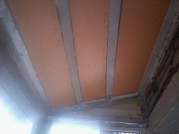 Immédiatement après l'installation de l'isolant, vous pouvez procéder au revêtement du plafond en plaques de plâtre. Il est nécessaire d'utiliser des panneaux résistants à l'humidité d'une épaisseur de 9 à 10 mm. Malgré la résistance relative du revêtement à l'humidité, il est judicieux d'isoler la cloison sèche avec un matériau recouvert d'une feuille. Cela doit être fait sans faute si l'humidité a pénétré le plafond de la loggia après son vitrage. Le folgoizol ou un autre substrat d'imperméabilisation doit être installé entre la mousse et les cloisons sèches afin que la couche d'aluminium soit dirigée vers l'intérieur de la pièce.