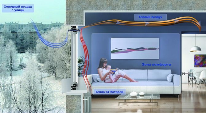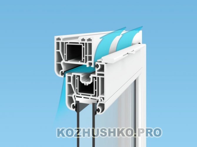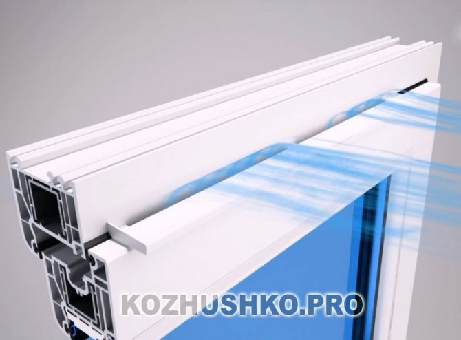 Une caractéristique clé des fenêtres auto-ventilées est que les profilés en plastique ont des trous spéciaux dans les parties inférieure et supérieure. Des flux d'air frais, se déplaçant continuellement de bas en haut à travers le cadre le long de la chambre intérieure, sont chauffés et fournis à l'appartement déjà réchauffé.