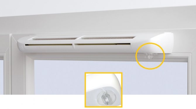 Une poignée de fenêtre avec une soupape d'admission est installée à la place de la poignée de fenêtre en PVC traditionnelle, sans compromettre son apparence. Il s'agit d'un appareil à flux direct pour fournir de l'air frais de la rue à la pièce. La conception peut inclure un filtre grossier qui nettoie les flux entrants des grosses particules de contamination - pollen, poussière, etc.