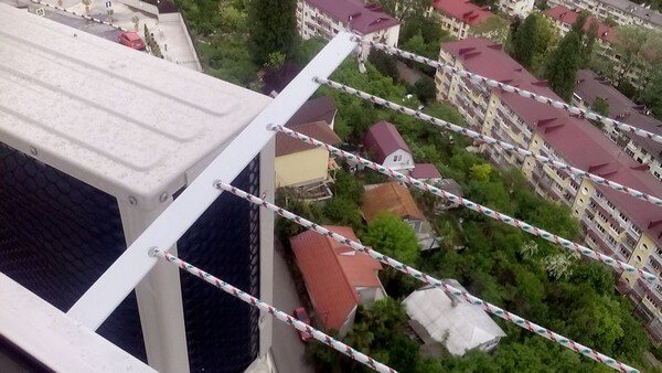 Si vous ne voulez pas vous soucier de l'installation, vous devez attacher les cordes à linge du balcon à la balustrade de l'intérieur. Parfois, une structure similaire est attachée au rebord de la fenêtre donnant sur la loggia. Le système peut contenir une pièce de support constituée de cordes ou d'échelons métalliques.