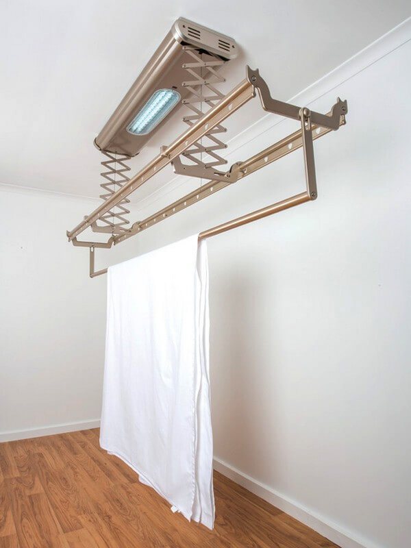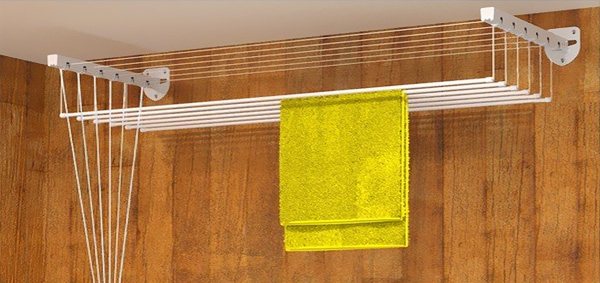 La structure est maintenue sous le plafond, mais les choses peuvent être atteintes à tout moment sans monter sur un tabouret. Ceci est important pour les personnes âgées et les femmes enceintes. La hauteur n'est pas difficile à régler, le long manteau peut être positionné de manière à ne pas toucher le sol. L'hôtesse a la capacité de tirer les barres pour qu'elles soient à des niveaux différents. Dans ce cas, le linge sèche plus uniformément.