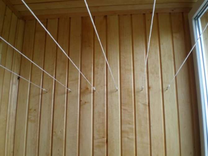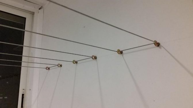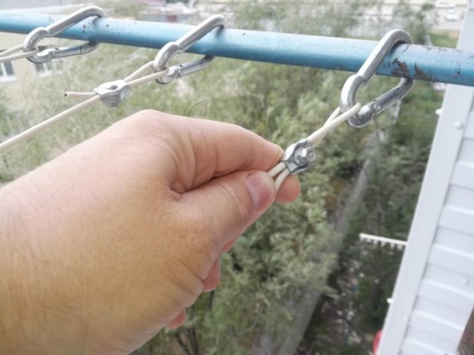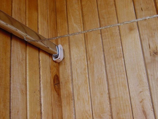 Un bloc de plastique est attaché à l'un des murs. Il doit être situé à une hauteur telle qu'il soit pratique pour l'hôtesse de suspendre des objets. Ensuite, les cordes sont tirées et fixées sur la paroi opposée à l'intérieur du deuxième bloc. Ce bloc est amovible, il peut être démonté, si nécessaire, afin de serrer les cordes affaissées sur le balcon ou de les remplacer par des neuves.